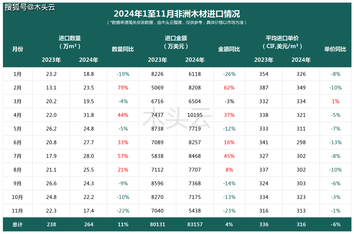 因为中国市场的木材库存充盈,这一现状进一步了对非洲木材的进口需求。据海关最新数据显示,2024年11月,中国自非洲进口的木材总量仅为17。4万立方米,取2023年同期比拟下降了22%,这一数字也创下了2024年以来非洲木材进口的最低记载。